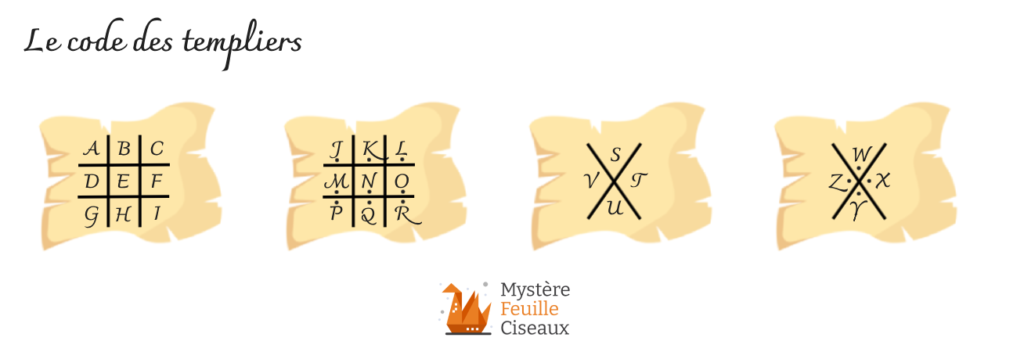 Le code des templiers fonctionne à l’aide d’un système de grille, grille qu’il faut forcément connaître pour coder ou décoder (cela ne s’invente pas contrairement à des codes plus simple comme le code César).